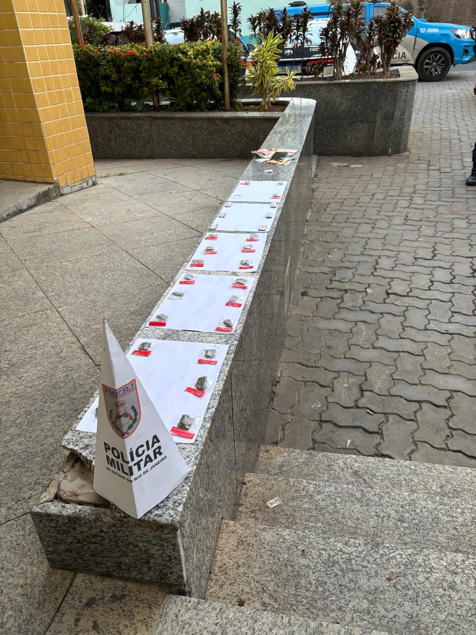 Os agentes observaram já suspeitos realizando as vendas e realizaram a abordagem, foi quando os três elementos empreenderam fuga para área de mata, vindo a pular sobre as casas existentes no local porém, após cerco tático e minuciosa varredura, foram encontrados e rendidos, arrecadado todo o material encontrado sendo, 22 sacolés de erva seca prensada similar a maconha sem descrição, seis sacolés de erva seca prensada similar a maconha, um pino contendo pó branco assemelhado a cocaína, dinheiro em espécie, um celular iPhone antigo.