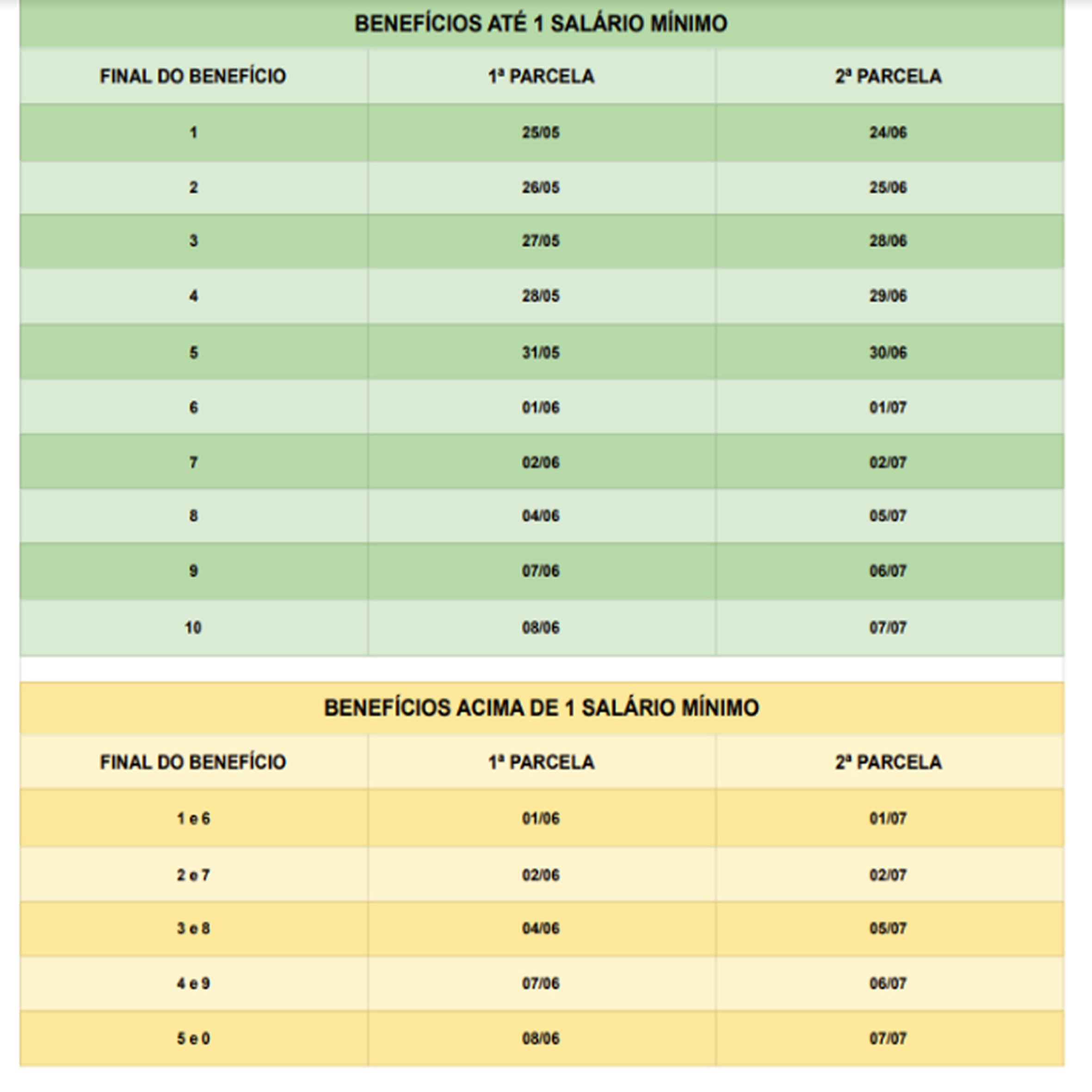 Para aqueles que recebem um salário mínimo, o depósito da antecipação começa hoje e segue até 8 de junho, de acordo com o número final do benefício, sem levar em conta o dígito verificador. Segurados com renda mensal acima do piso nacional terão seus pagamentos creditados entre 1º e 8 de junho. Abaixo, a tabela oficial do INSS: