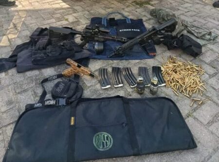 Durante as buscas, os agentes encontraram no veículo dois fuzis calibre 5.56, uma pistola calibre 9 mm com kit rajada, cinco carregadores para 30 munições, um carregador de 60 munições, um carregador “drum” com capacidade para 100 munições, dois coletes balísticos, placas de proteção, munições ainda a contabilizar e duas granadas.