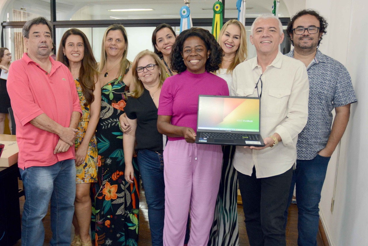 Durante o evento de premiação, realizado no gabinete do prefeito Rodrigo Drable, nova remessa de notebooks foi entregue a unidades de ensino municipais. Ao todo, mais 452 foram disponibilizados, lembrando que 777 computadores já haviam sido distribuídos em maio de 2022 às escolas. O secretário de Governo, Fanuel Fernando Faria, acompanhou a entrega de medalhas e certificados a 22 alunos e dos equipamentos às equipes diretivas.