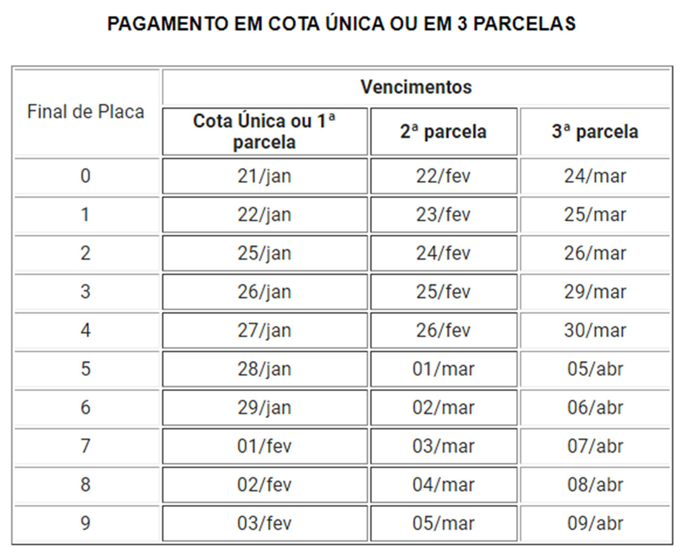 O Governo do Estado do Rio de Janeiro definiu as datas de pagamento do IPVA de 2021. Os contribuintes que optarem pela quitação em cota única, dentro do prazo previsto, terão desconto de 3% no valor do imposto. De acordo com o calendário, o primeiro vencimento da quitação e da primeira parcela acontece no dia 21 de janeiro do próximo ano, para os veículos com placa final 0 (zero). Para os proprietários que preferirem parcelar, será permitido o pagamento, sem desconto, em três vezes mensais iguais, conforme o número final da placa do veículo.