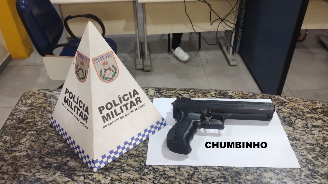 Durante as diligências, os policiais realizaram buscas na região e localizaram, nos fundos do terreno da residência, uma bolsa escondida, onde foi encontrada uma pistola de ar comprimido, marca Beeman P17. O suspeito não foi localizado no primeiro momento, mesmo após buscas em endereços indicados por familiares.