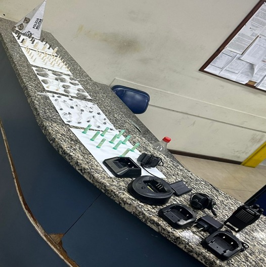 Durante buscas na área, os agentes encontraram uma sacola plástica contendo diversos entorpecentes, entre eles cocaína, maconha, crack e skank, além de um rádio transmissor e acessórios utilizados para comunicação.