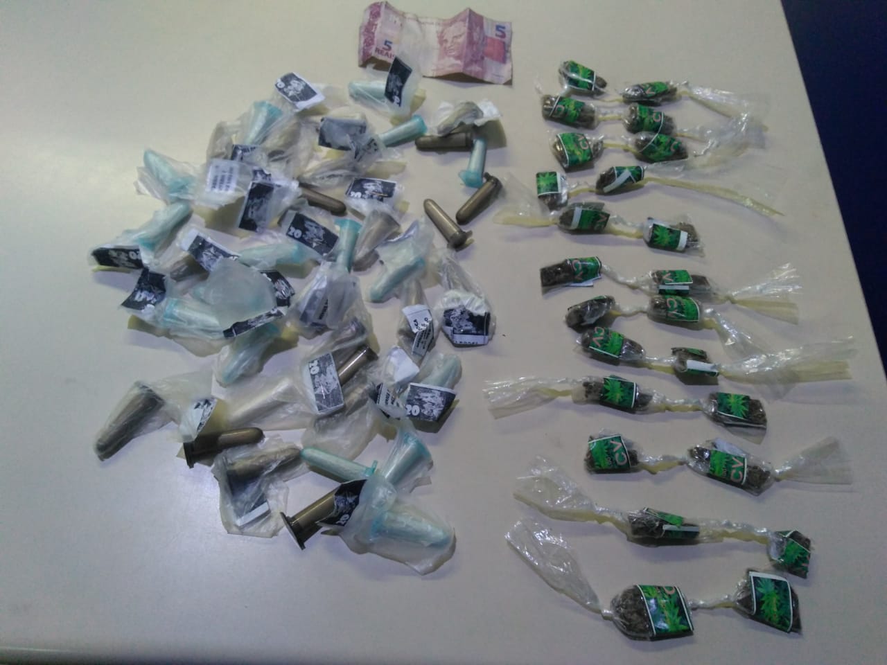 Já no bairro Itapuca, por volta das 18h40min, os policiais apreenderam 39 pinos de cocaína e 20 invólucros de maconha, na Rua Hostílio de Souza. “Recebemos a informação de que um homem negro estaria comercializando drogas no local. Quando nos aproximamos, o suspeito saiu correndo. Após buscas na localidade encontramos a sacola plástica com as drogas”, explicaram os militares que apresentaram toda a droga na Delegacia.