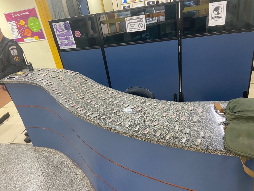Ele estava com uma mochila contendo 21 tiras de maconha “BP CV Achocolatada 25”; 98 tiras de maconha “BP CV Achocolatada 5”; um rádio transmissor, um celular e R$ 22 em espécie.