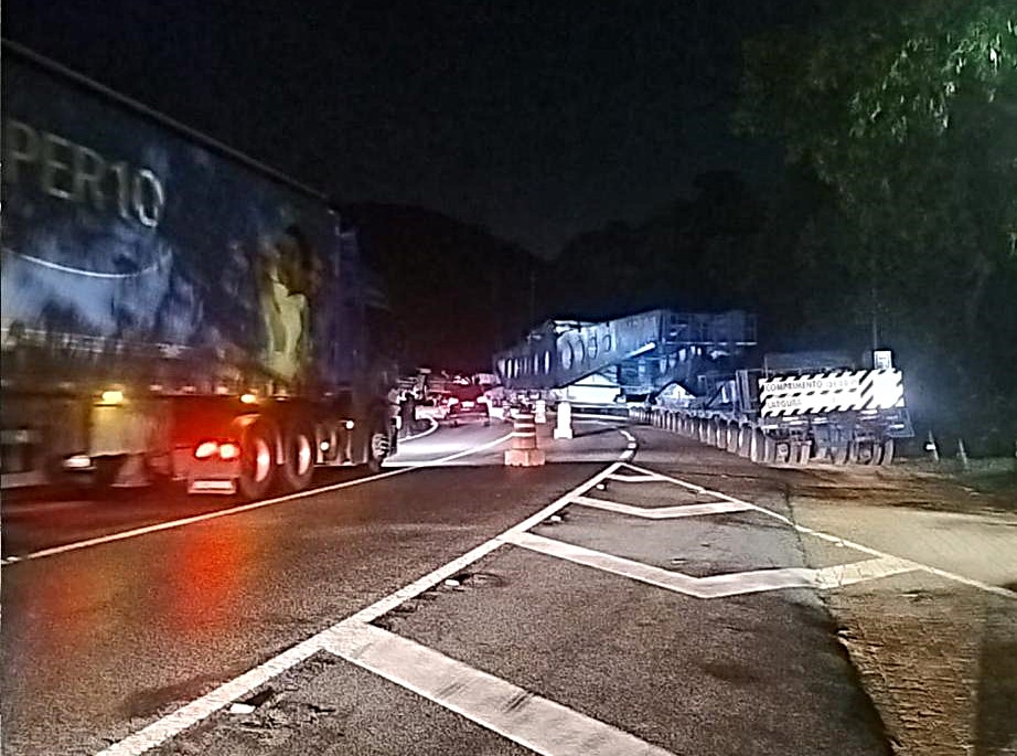Com o adiamento, as equipes passaram a recolocar os malotes de concreto que haviam sido removidos para permitir a passagem da carga especial. Parte do trabalho precisou ser realizada na manhã desta segunda-feira, já que as condições climáticas impediram a conclusão do serviço durante a madrugada.