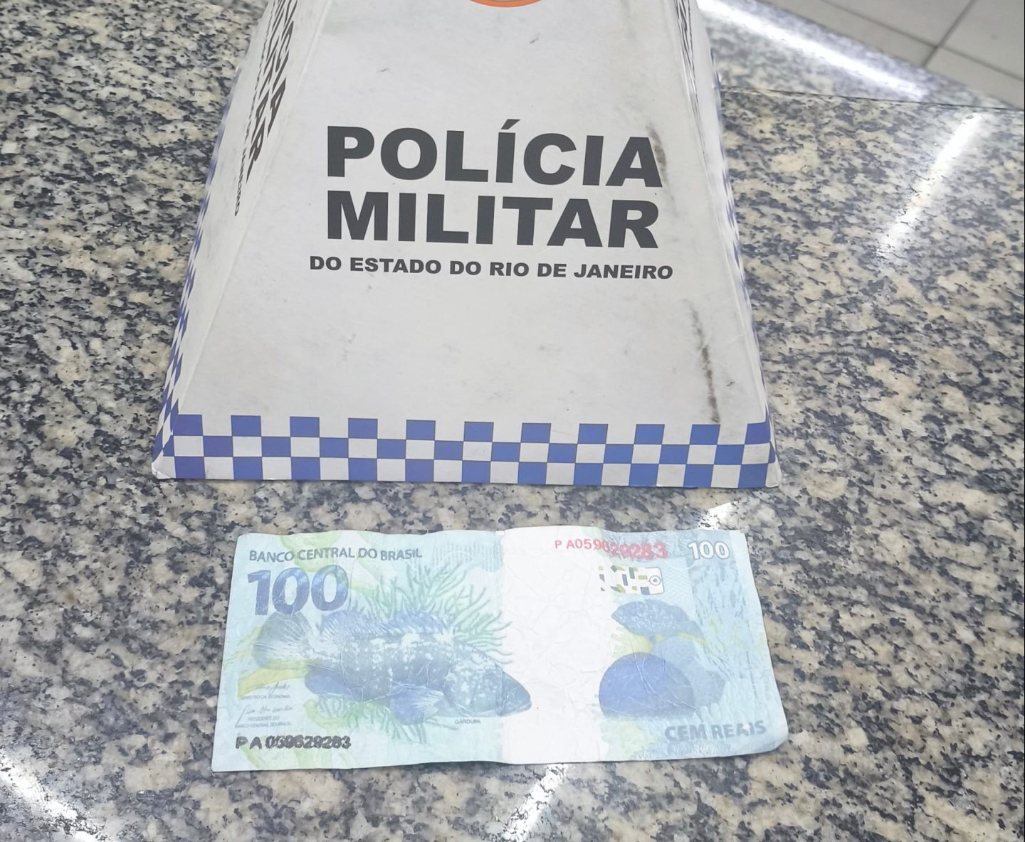 Segundo os policiais, a nota apresentava sinais evidentes de falsificação, como letras borradas, ausência da marca d’água do peixe, textura diferente, tamanho inferior ao de uma cédula verdadeira e cores distintas nos dois lados.