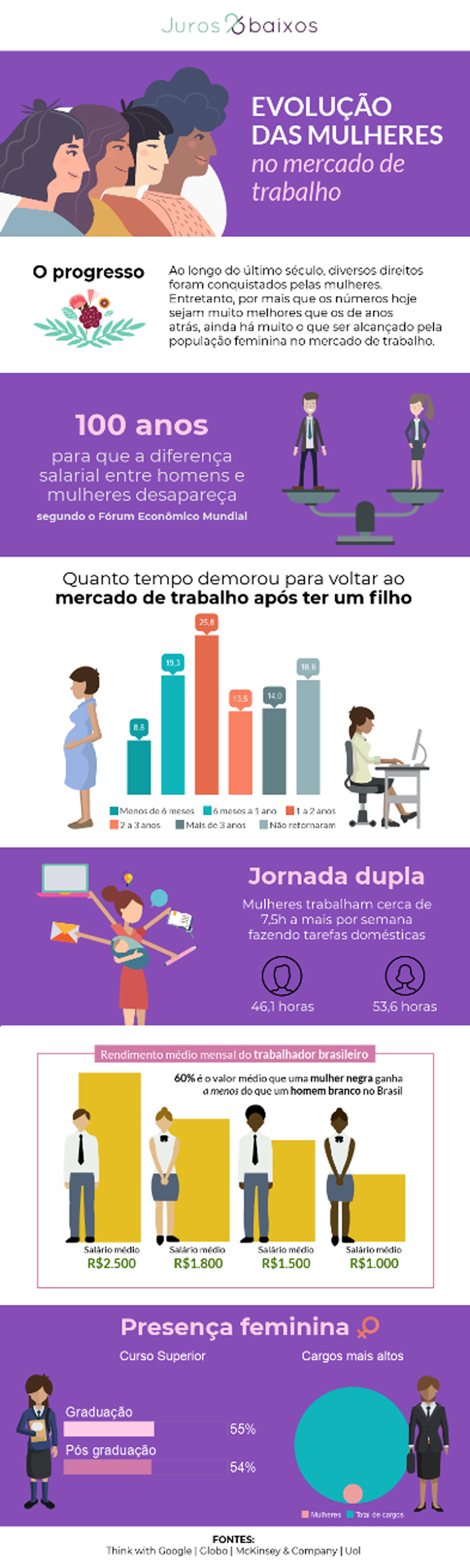 Segundo o Fórum Econômico Mundial, o fim da desigualdade está previsto para daqui a 100 anos, um tempo significavelmente longo para uma sociedade considerada moderna em vários parâmetros. Para entender melhor a evolução delas e a diferença entre os homens no mercado, confira abaixo o infográfico preparado pelo Juros Baixos.