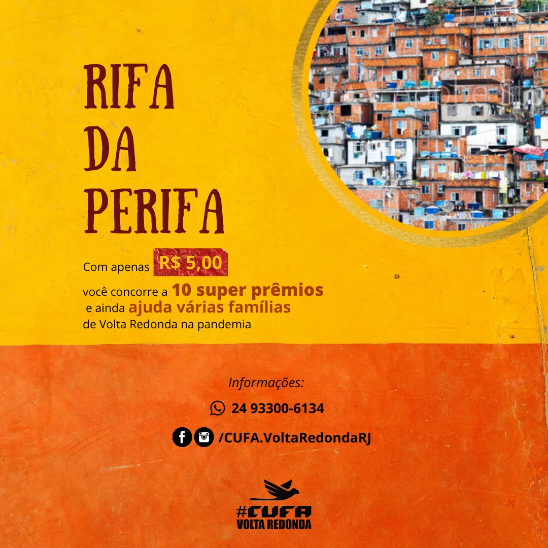 A Central Únicas das Favelas (Cufa) agora está na cidade de Volta Redonda e como já era de se esperar ela chegou já movimentando a cidade do Aço lançando a ‘Rifa da Perifa’ que tem como objetivo combater a fome durante a pandemia do coronavírus que segue assolando o país. O valor de cada bilhete da rifa é de R$ 5. Ao adquirir um número o comprador estará concorrendo a dez super prêmios. Os valores arrecadados com a venda da rifa serão revertidos para a compra de cestas básicas que serão distribuídas para as famílias da periferia da cidade do Aço. Para participar da rifa, os interessados podem acessar o link: botanarifa.com/rifadaperifa.