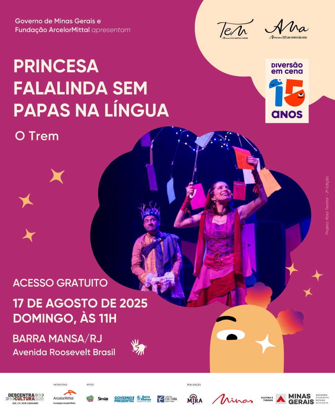 Barra Mansa recebe no domingo, dia 17, às 11 horas, a peça “Princesa Falalinda, Sem Papas na Língua”, gratuitamente na Avenida Roosevelt Brasil, no Centro. O espetáculo faz parte do programa Diversão em Cena, da Fundação ArcelorMittal, com apoio da Prefeitura, promovendo acesso à cultura para crianças, jovens e adultos.