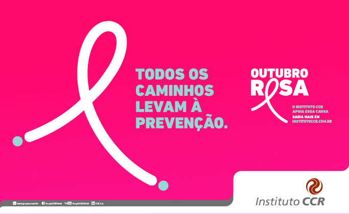 Mais uma vez o Instituto CCR e a CCR NovaDutra apoiam o movimento Outubro Rosa, uma iniciativa mundial que lembra a importância da prevenção do câncer de mama. As concessionárias do Grupo CCR divulgam orientações sobre prevenção e outras informações sobre a doença em seus canais internos e externos e realizam atividades diversas junto aos colaboradores da companhia. E este ano, o Instituto promoverá, para toda a companha, uma palestra com médico e o depoimento de uma pessoa que enfrentou o câncer de mama.