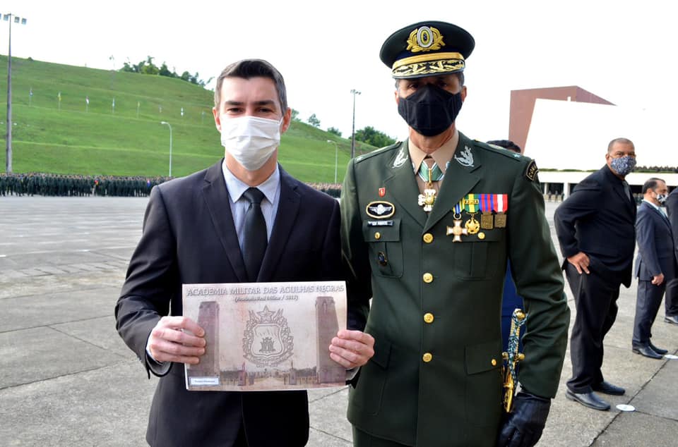 O prefeito de Resende, Diogo Balieiro Diniz, recebeu na manhã de segunda-feira, dia 19, o diploma de Colaborador Emérito do Exército. A honraria foi ofertada pelo comandante da Aman, o general de Brigada, Paulo Roberto Rodrigues Pimentel, em comemoração ao Dia do Exército. “Fico muito feliz e lisonjeado com a honraria, que é o reconhecimento da parceria que firmamos, ao longo dos últimos anos, com essa importante instituição brasileira. Agradeço ao general Pimentel pelo Diploma, e a todos os militares, oficiais, praças, soldados e cadetes, que reforçam a parceria que selamos entre a Aman e a Prefeitura de Resende. Que a tradição, hierarquia, disciplina e amor à Pátria, princípios do Exército, sejam sempre valorizados em nosso país”, disse o prefeito em suas redes sociais.