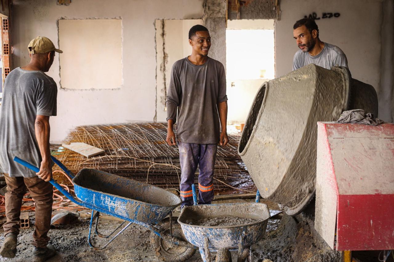 Em fases anteriores, foram executados todos os serviços de fundação e aterro. Na sequência, ocorreu o levantamento das paredes da unidade por meio da alvenaria. Os operários também realizaram a preparação das ferragens das vigas e pilares superiores, etapa essencial que possibilitou a concretagem e o assentamento da laje.