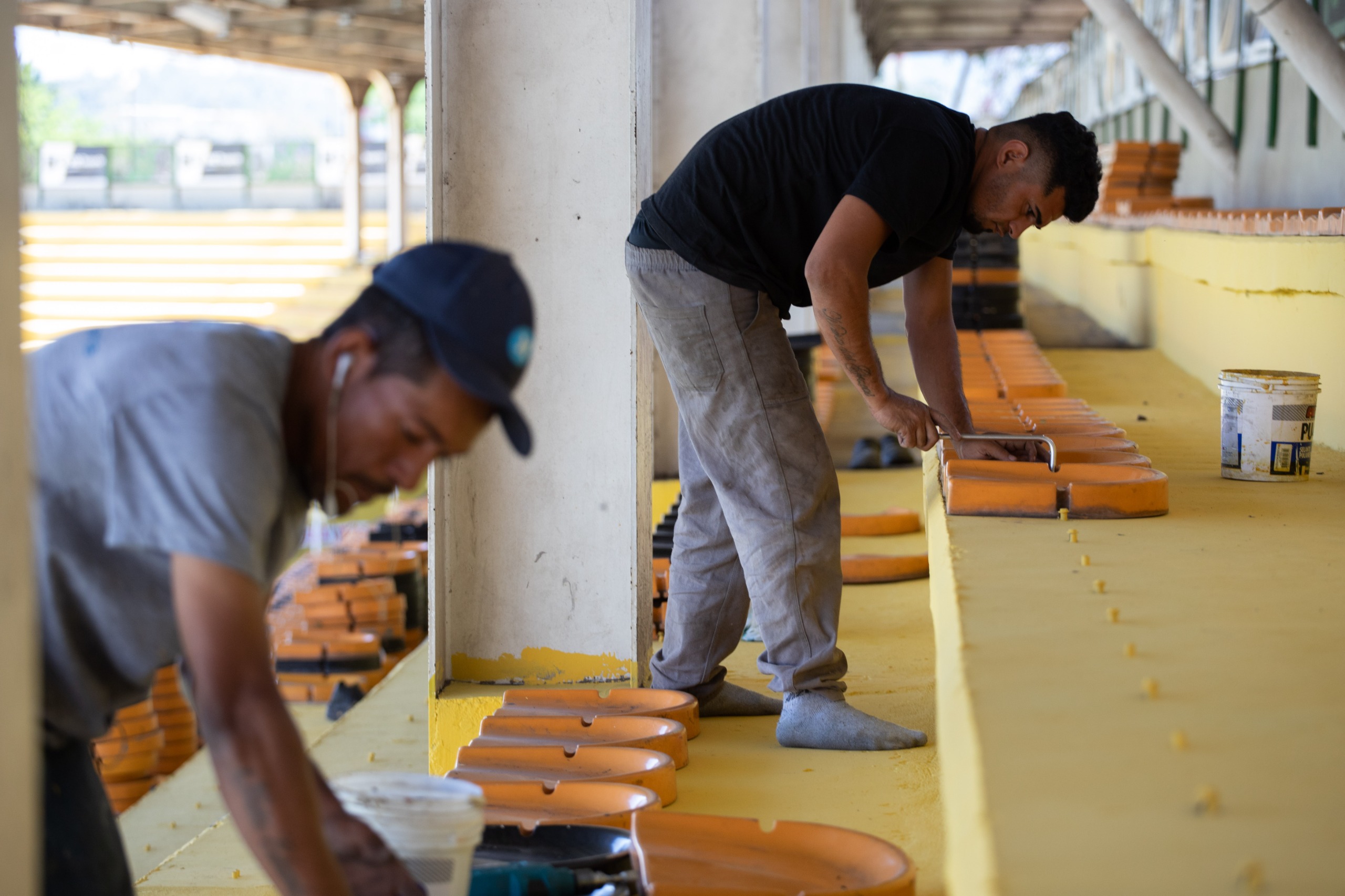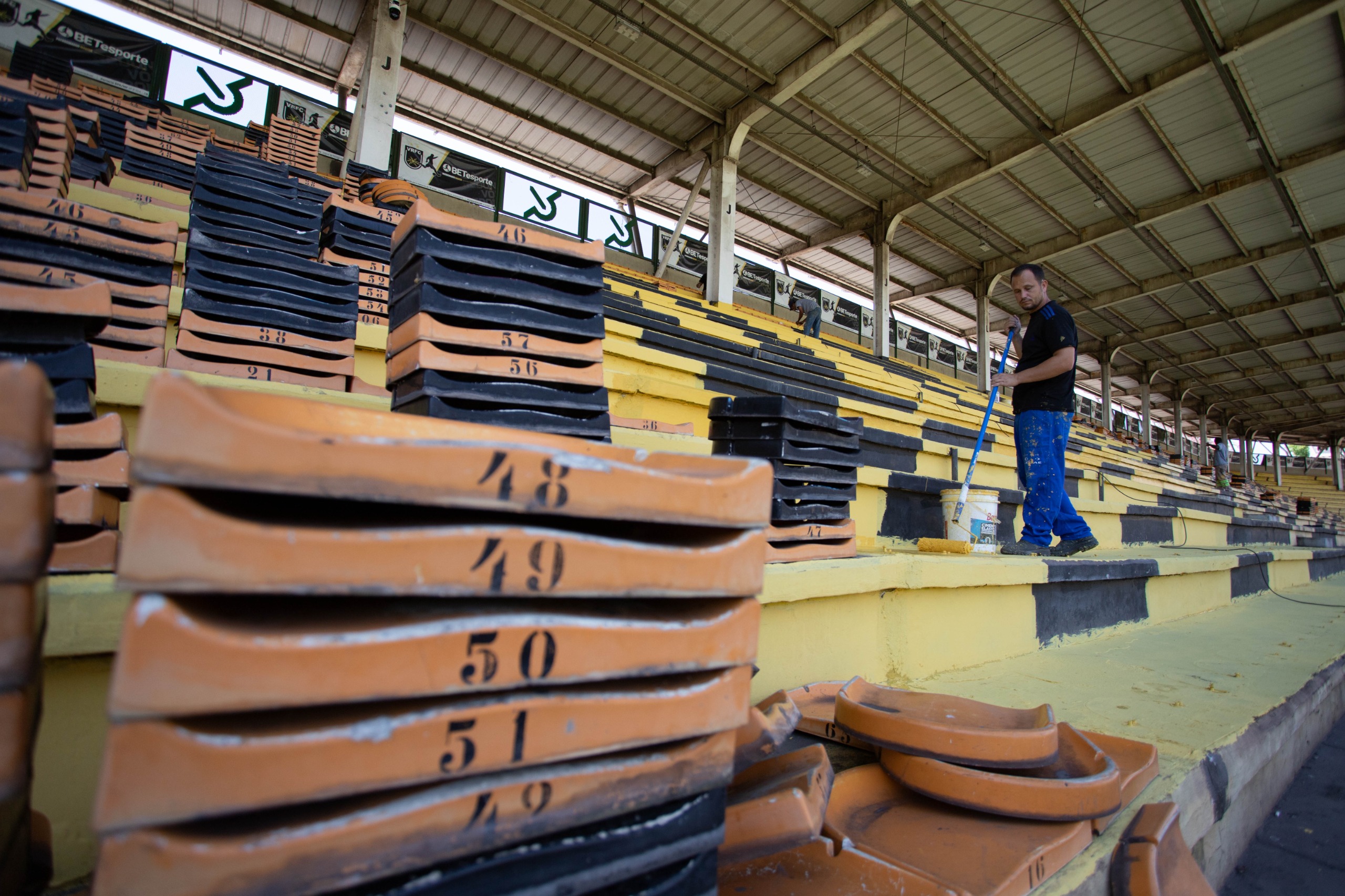 AOs assentos da arquibancada coberta do lado oposto foram retirados, a fim de realizar a nova pintura e posterior recolocação dos assentos recuperados - Cris Oliveira /PMVR