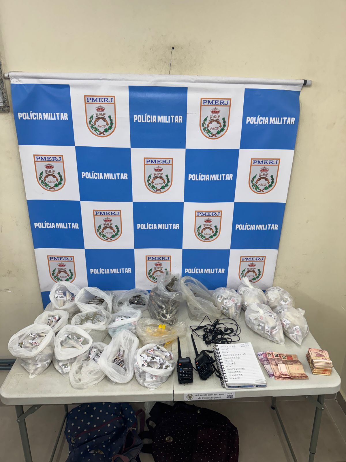 Durante as buscas, policiais localizaram duas mochilas escondidas próximas a residências. Dentro delas havia centenas de pinos de cocaína, pedras de crack, porções de maconha, comprimidos de ecstasy, frascos de lança-perfume, rádios comunicadores, anotações do tráfico e dinheiro em espécie.