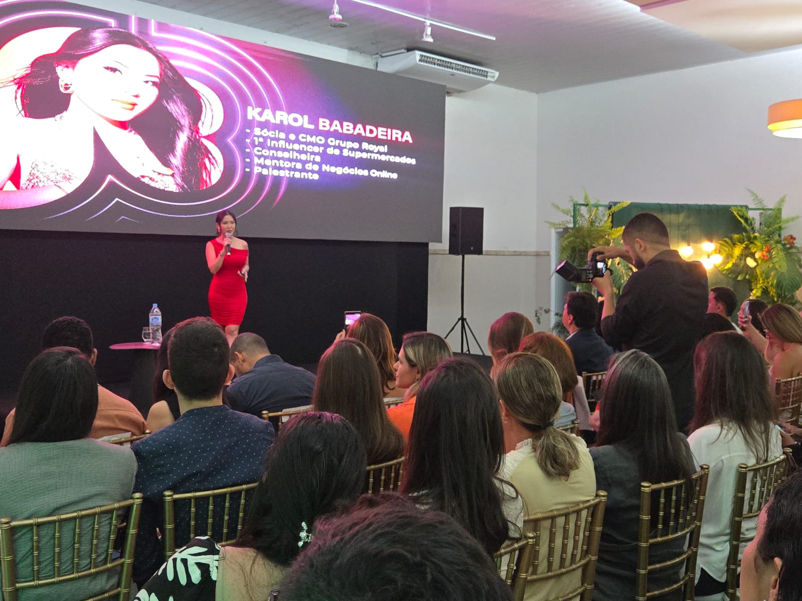 Karol Babadeira – nome artístico de Karolina Kaory Chokyu – levou ao palco uma narrativa que mistura trabalho, reinvenção e legado familiar. Ela é sócia e diretora de marketing do Grupo Royal, redes de supermercados com mais de 2 mil colaboradores e 13 lojas em cinco cidades do Sul Fluminense e Baixada, além de uma em construção na Região Serrana.