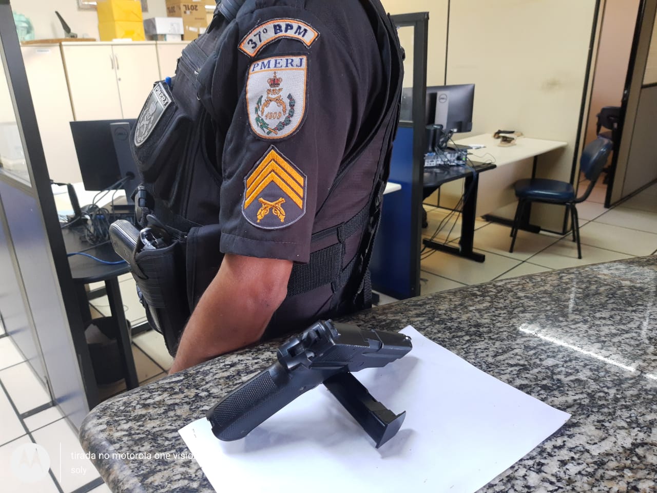 Em duas ocorrências feitas por policiais do 37º Batalhão de Polícia Militar (BPM), na segunda-feira, dia 04, nos municípios de Porto Real e Quatis, foram apreendidos uma pistola 9mm, um carregador, 16 munições do mesmo calibre, dois celulares, além de um simulacro de pistola. Um jovem de 17 anos foi apreendido em uma das ocorrências.