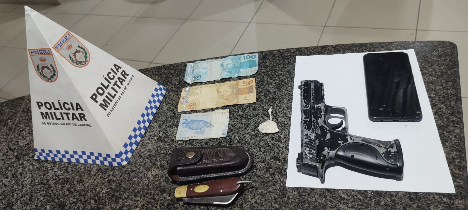 Durante a revista, os agentes localizaram um simulacro de pistola e um canivete sob a caminhonete. Com o suspeito, foram encontrados um invólucro contendo pó branco, um celular e R$ 152 em dinheiro. Todo o material foi recolhido e o homem encaminhado à 91ª Delegacia de Polícia (DP), onde o caso foi apresentado.