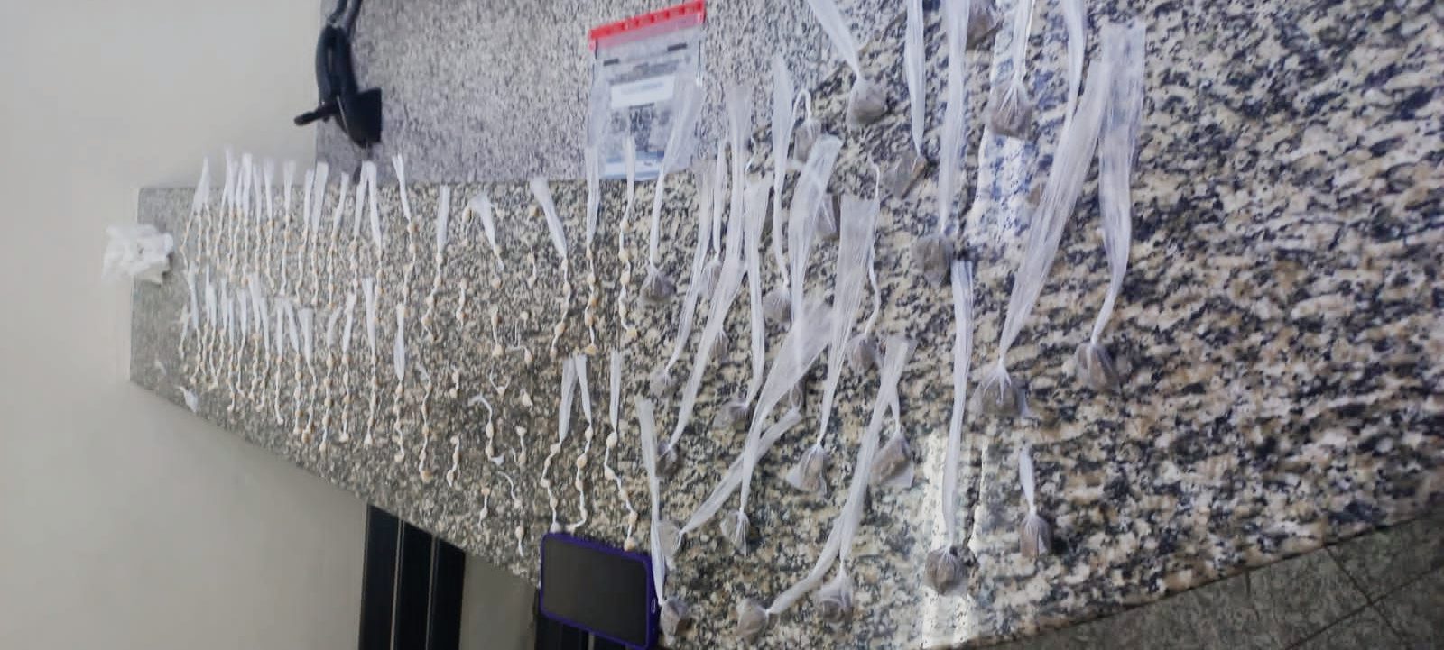 O flagrante ocorreu também após denúncia anônima, sendo localizados, com um suspeito de 21 anos e outro, de 24 anos, 51 pinos de cocaína, mais de R$ 300 em espécie e folhas de anotações do tráfico.