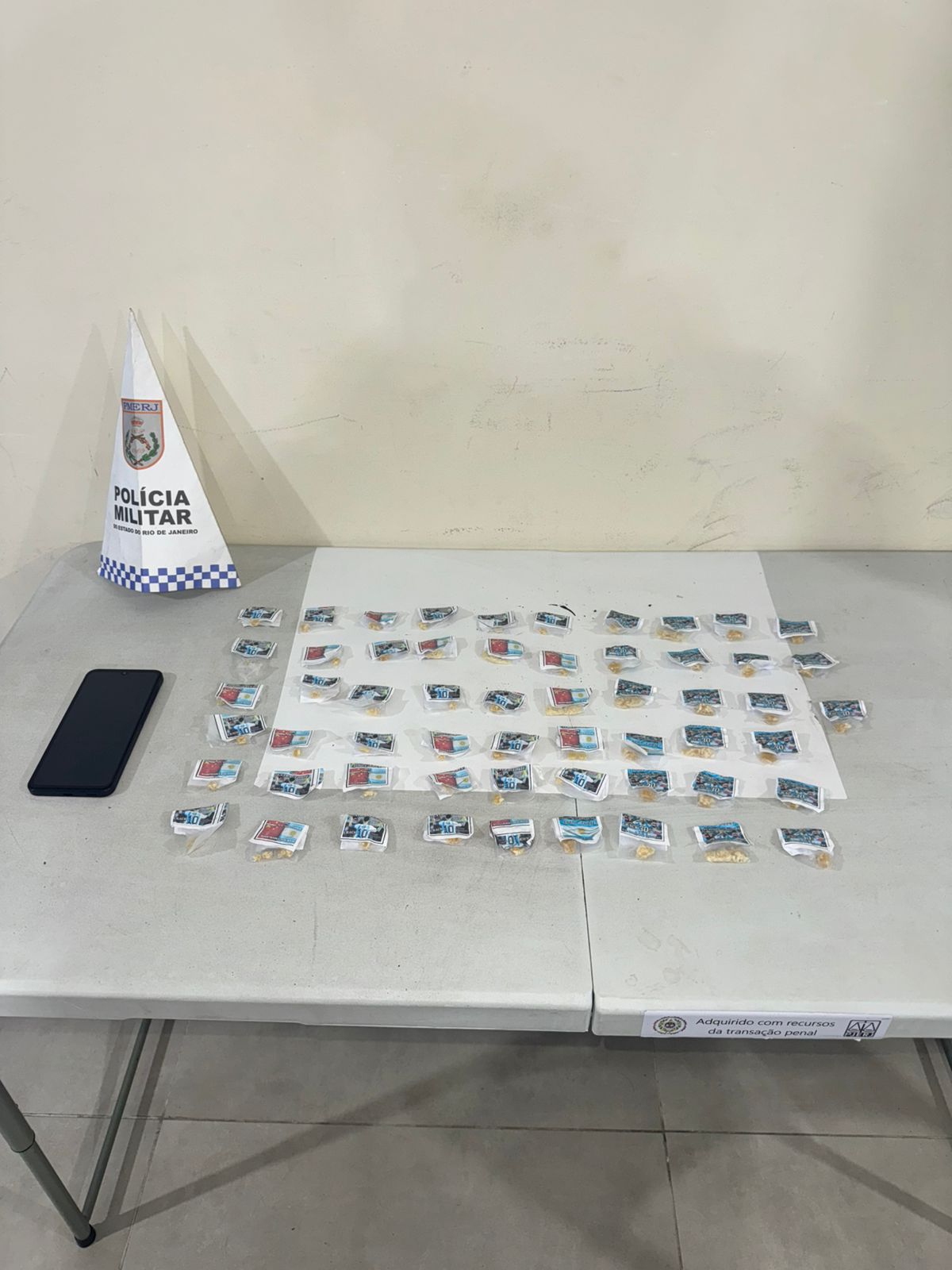 Após perseguição, os dois foram alcançados na Rua Recife, no bairro Vila Americana. Durante a abordagem, nada de ilícito foi encontrado com eles, mas os policiais realizaram buscas pelo trajeto da fuga e localizaram 57 pedras de crack, totalizando 38 gramas, além de um celular azul, um carregador e um fone de ouvido.