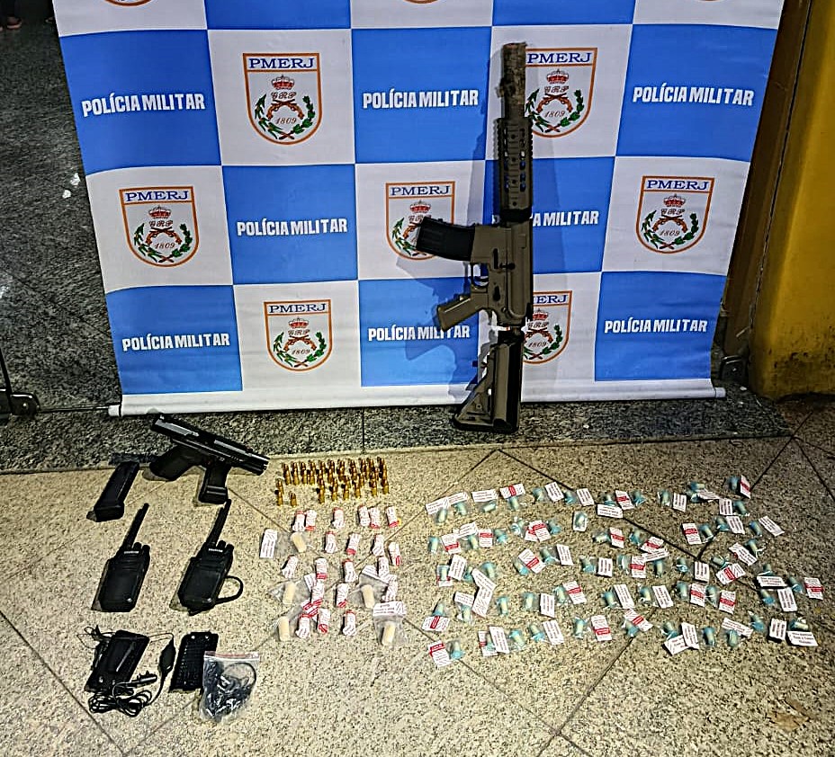 Em Quatis, no bairro Barrinha, os agentes foram até a Avenida Roberto Silveira após denúncia sobre um homem armado vendendo drogas. O suspeito fugiu para uma área de mata ao perceber a presença policial, abandonando uma mochila e uma sacola plástica. No local, foram apreendidos uma pistola calibre 9mm com numeração raspada, dois carregadores, 37 munições, uma réplica de fuzil, 82 pinos de cocaína, rádios comunicadores e baterias.