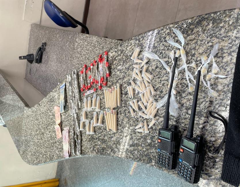 Foram apreendidas 25 trouxinhas de maconha de 179 gramas, 50 de cocaína de 62 gramas, 17 pedras de crack, dois rádios, uma touca ninja e R$ 80 em espécie.