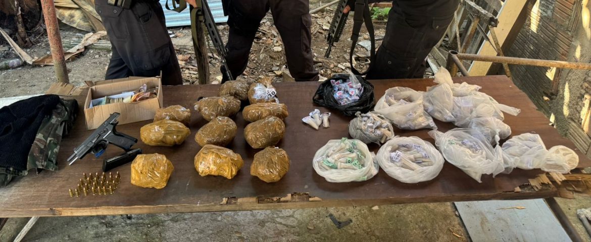 Após receberam denúncia de que em uma residência de uma Vila de casas, na Rua José Abba, no bairro Jardim Real, estaria ocorrendo tráfico de drogas, foram verificar a informação. Quando se aproximaram do endereço, avistaram o suspeito denunciado, que já conhecido da Polícia Militar por envolvimento no tráfico de drogas. No entanto, ele conseguiu fugir. Em diligência no quintal de um dos imóveis, os policiais encontraram uma sacola de nylon contendo bolas com 1030 pinos de cocaína, uma tira de maconha, além de caixa com pistola, munições, carregadores e R$2.232 em dinheiro.