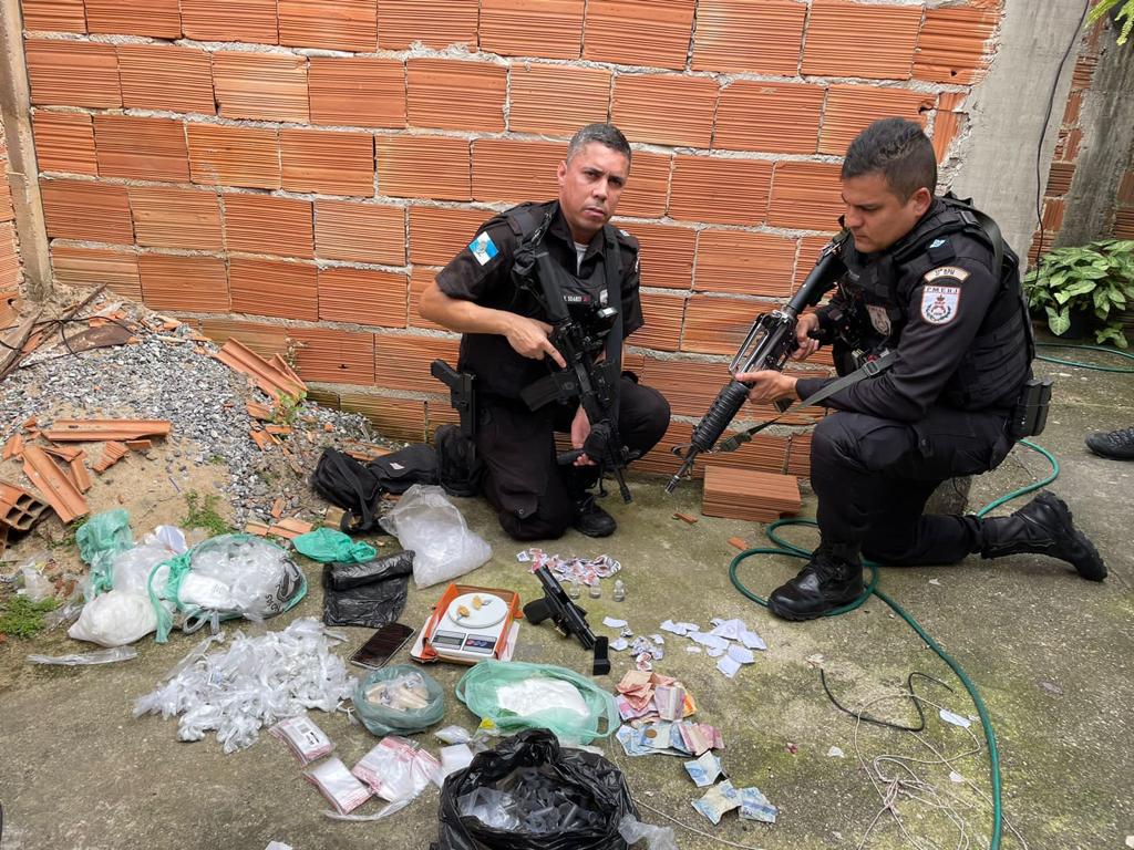 Já outra equipe da PM, com o apoio do Batalhão de Ações com Cães (BAC) da Polícia Militar do Estado do Rio de Janeiro entraram no bairro Baixada da Olaria. Na rua Xis, os policiais do BAC notaram uma mudança de comportamento dos cães Khabibi, Jason e Sherlock, nas proximidades de um terreno baldio. Os cães encontraram um carregamento de drogas contendo 27 tabletes com um quilo cada e quatro trouxinhas de maconha.