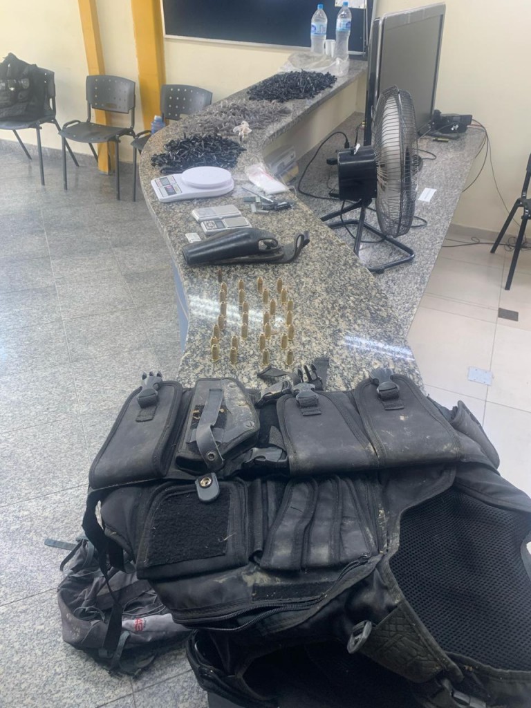 Após denúncia, policiais do 37º Batalhão de Polícia Militar (BPM) aprenderam uma mochila contendo munições calibre ponto 45, 9 mm, capa de colete balístico, coldre, balanças de precisão, além de vários sacos de pinos plásticos vazios usados para embalar drogas e sacos de “sacolé”. A mochila foi encontrada próximo de um curral em uma fazenda na Vila Pinheiro. Até o fechamento desta edição nenhum suspeito de tráfico de drogas havia sido preso.