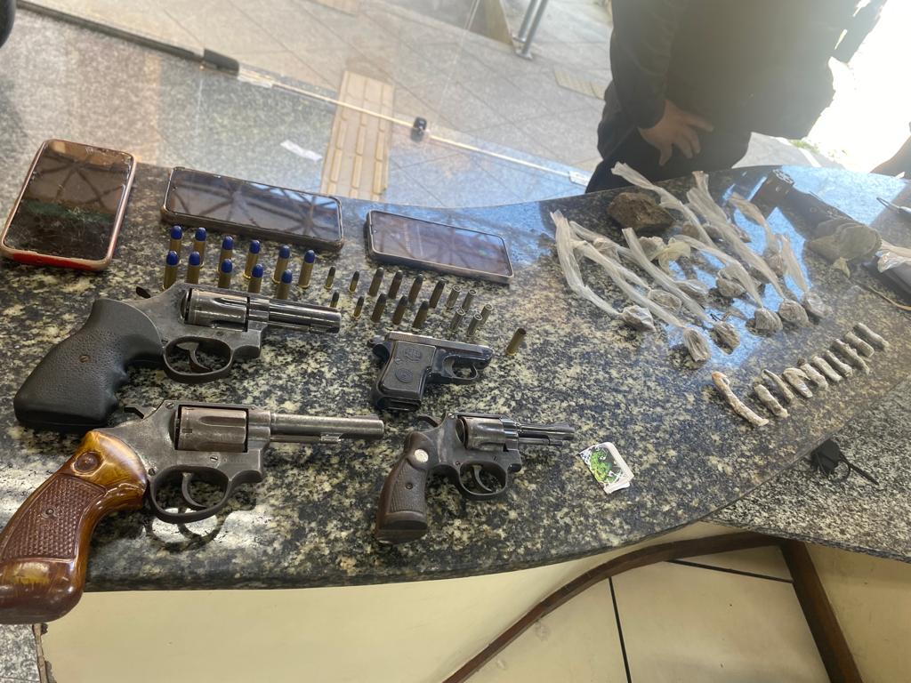 Com os suspeitos foram encontrados três revólveres, sendo dois calibre 38 e outro calibre 32, uma pistola calibre 6.35, além de 28 munições, 27 unidades e um tablete grande de maconha. Eles estavam em uma Toyota Ethios.