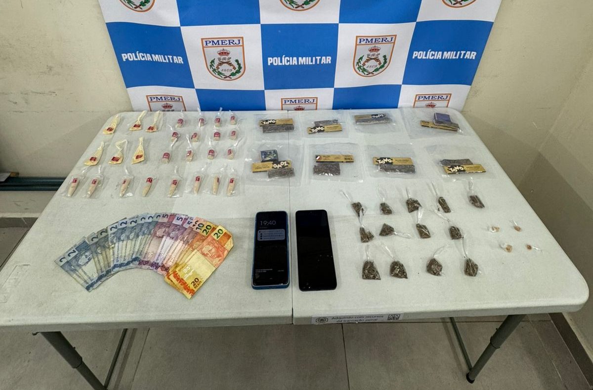Durante a revista, foram apreendidos 99 gramas de maconha, 34 gramas de cocaína, uma grama de crack, dois aparelhos celulares e R$ 95 em dinheiro. Um dos detidos confessou atuar como olheiro, enquanto o outro assumiu a função de responsável pela venda dos entorpecentes.