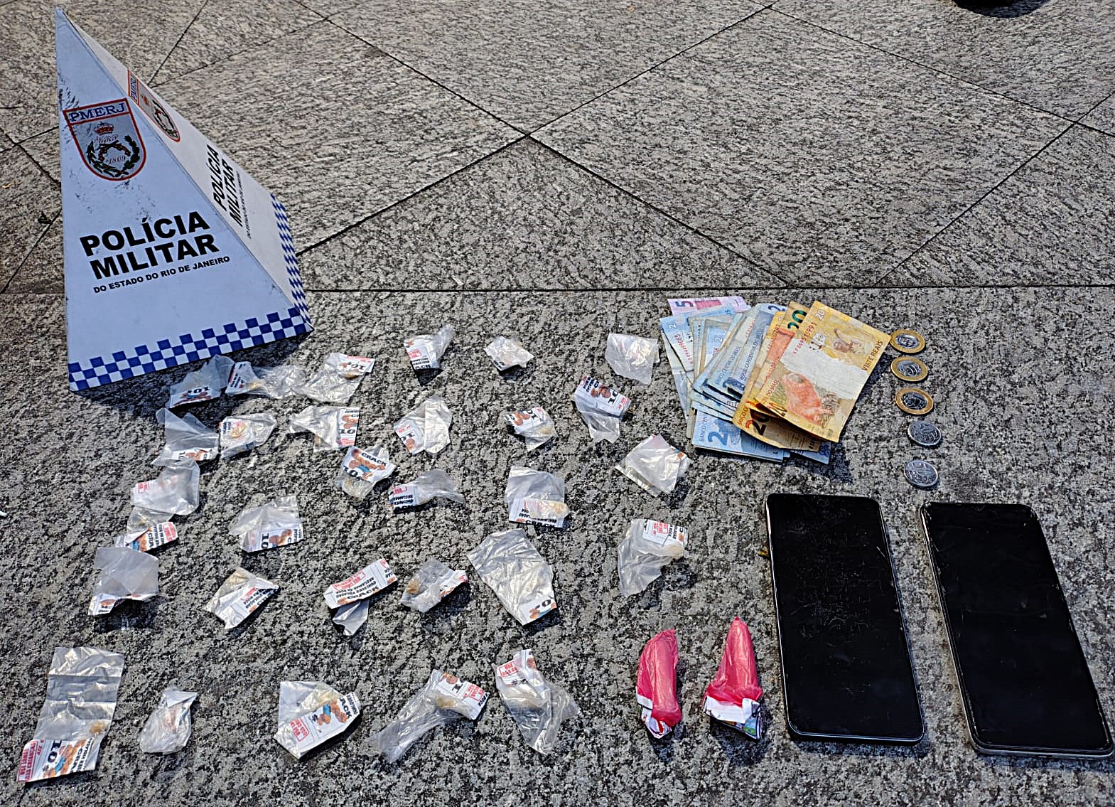 Após receberem denúncia sobre a comercialização de entorpecentes na Rua Irene Dias de Barros, os policiais foram até o local. Durante monitoramento, foi possível observar dois homens, sendo que um deles carregava uma sacola plástica. Os militares realizaram o cerco e conseguiram deter os suspeitos. Durante a abordagem, um dos homens estava com R$ 80 e um aparelho celular. O segundo suspeito também portava um celular. Em buscas nas proximidades, os agentes localizaram a sacola plástica contendo R$ 39 em dinheiro, 30 pedras de crack e dois pinos de cocaína.