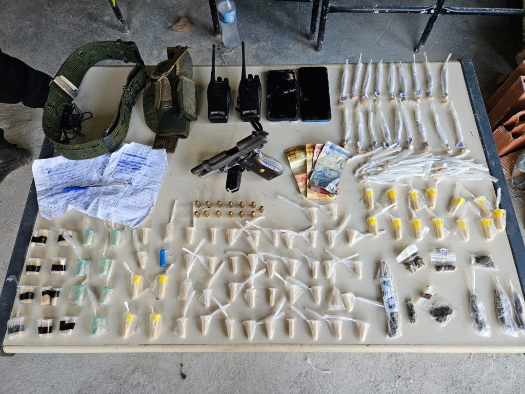 Os agentes foram ao local para conferir denúncia de tráfico de drogas. Foi feito o cerco e observaram um dos detidos, com o rádio comunicador preso na cintura e com uma sacola plástica, onde outro homem pegava o que tinha dentro da sacola. Após a abordagem, foi verificado que tinham 70 pinos de cocaína, oito sacolés de crack e R$ 52 na sacola. O homem estava com um caderno de anotação. O suspeito que retirava as coisas da primeira sacola também estava com outra com 13 sacolés de crack, nove de maconha. Outros três homens estavam próximo e um deles fugiu. O outro disse que estava comprando droga, mas a polícia desconfiou, e outro, estava com cinto tático com uma arma de fogo. Esse é o que tinha mandado de prisão em aberto e também estava com os demais materiais apreendidos.