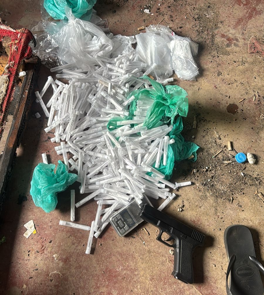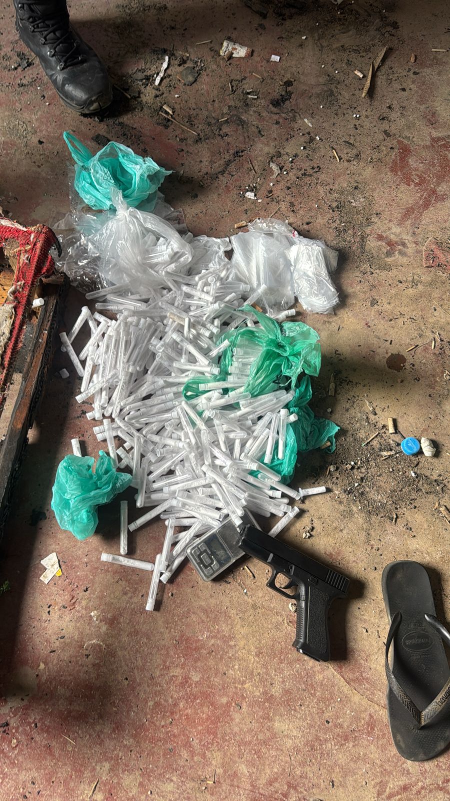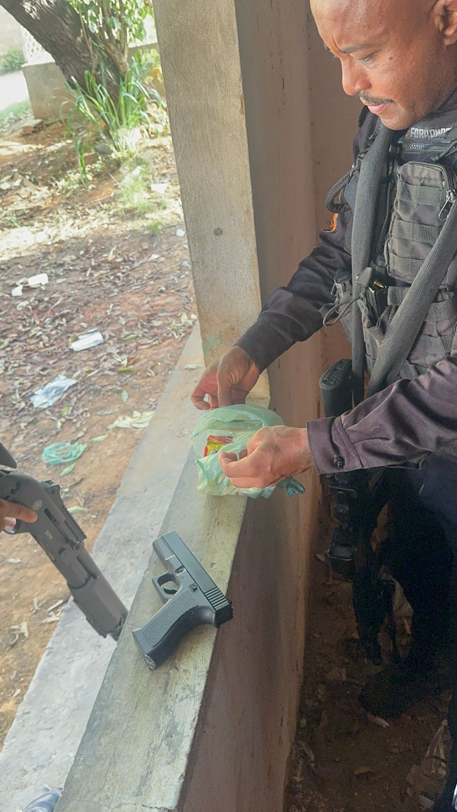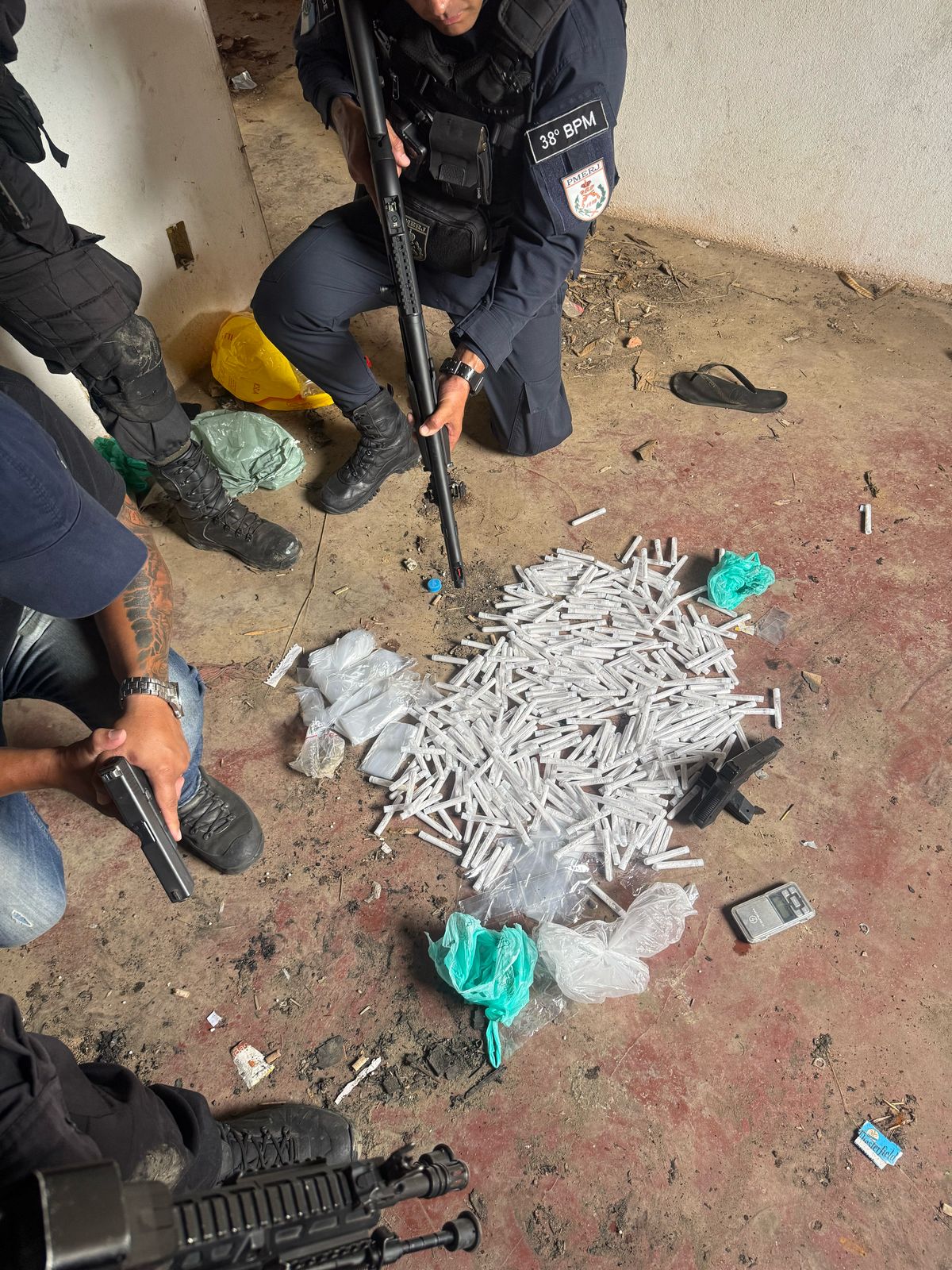 A ação teve início após o monitoramento do Serviço de Inteligência, que identificou a movimentação suspeita de indivíduos em um bloco e em uma casa abandonada próxima ao evento. Com base nas informações, equipes do Grupo de Ações Táticas (GAT) e do Serviço Reservado se deslocaram até o local. Ao perceberem a aproximação dos policiais, os suspeitos fugiram, abandonando uma bolsa com 400 pinos grandes de cocaína, além de 64 gramas da droga escondidas no teto da residência e o simulacro de arma de fogo.