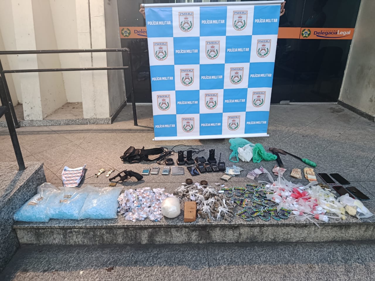 Durante as buscas, foram localizadas três mochilas na varanda da residência, contendo 524 pedras de crack, 56 pinos de cocaína, 180 dolas de maconha, 57 frascos de Loló, um tablete de maconha, uma bola de pasta base de cocaína, um revólver calibre 38 com cinco munições, cinco aparelhos celulares, cinco rádios comunicadores com suas bases, um cinto tático com coldre, quatro balanças de precisão, R$ 366 em espécie e cerca de três mil pinos vazios para embalar drogas.