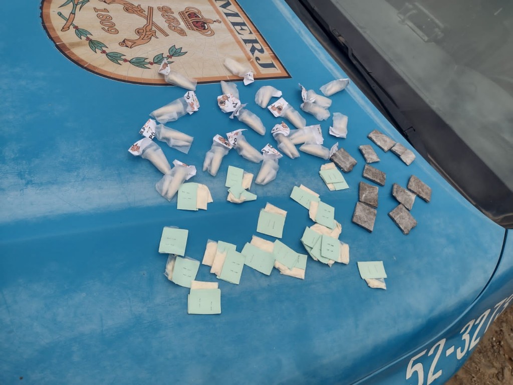 A guarnição recebeu informações e no local encontrou uma bolsa contendo 40 pinos de cocaína, 23 sacolés de cocaína e um tablete de maconha.