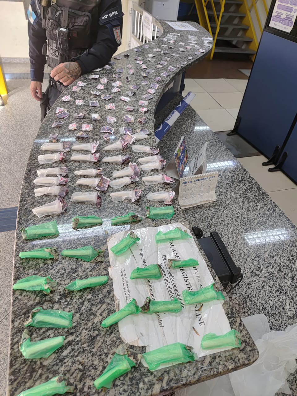 Em Barra do Piraí, na Rua Sebastiana Silva, bairro Areal, policiais do Setor Bravo localizaram uma bolsa contendo grande quantidade de drogas atrás de uma tábua em uma cerca, após denúncia sobre a atuação de traficantes da facção Comando Vermelho (CV). Foram apreendidas porções de maconha, crack e cocaína com diferentes valores de venda, totalizando mais de 150 unidades de entorpecentes. O material foi encaminhado à 88ª DP, onde ficou retido para análise.