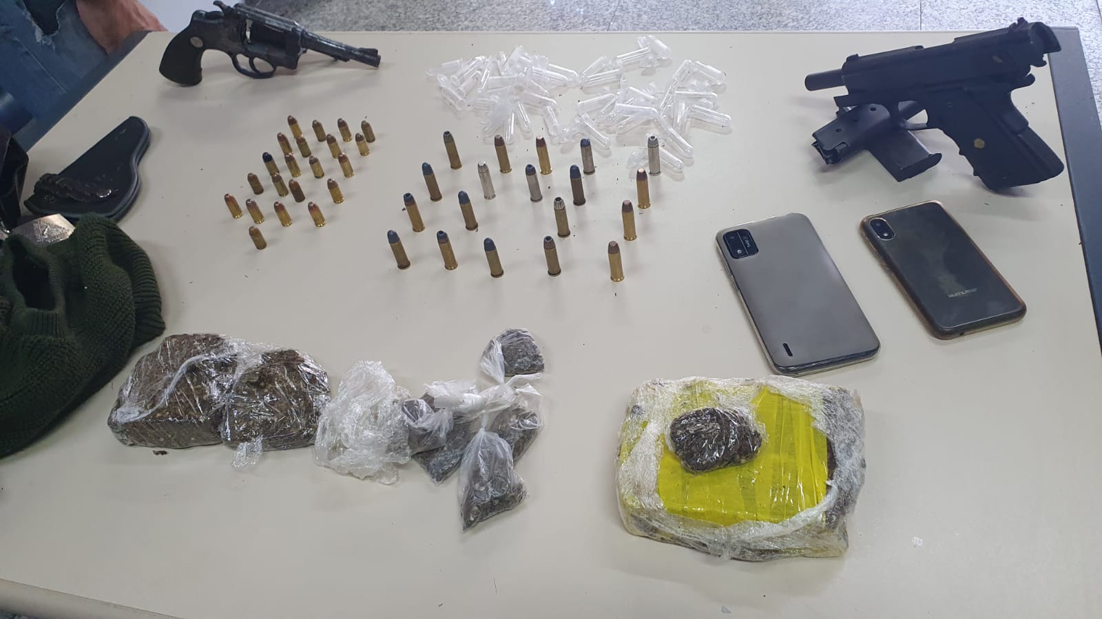 Na casa do suspeito, os policias encontram uma pistola 380, um revólver. 38, diversas munições, um coldre da polícia civil de Minas Gerais, uma quantidade substancial de maconha (um tijolo), além de material para endolação de drogas.