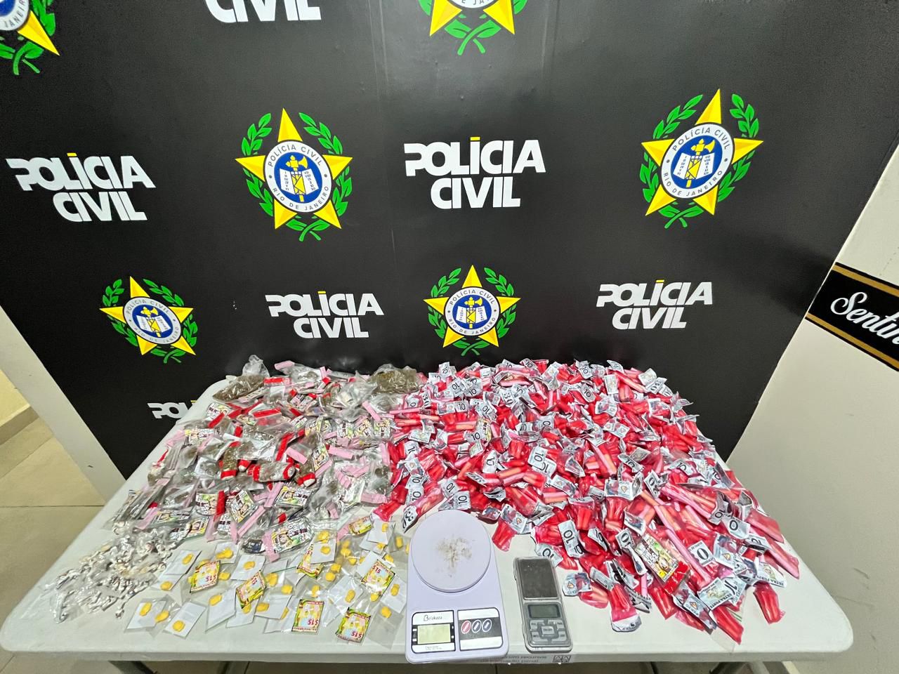 Durante as diligências na residência da acusada, os agentes apreenderam grande quantidade de entorpecentes e materiais ligados ao tráfico: 950 pinos de cocaína, 212 porções de maconha, 94 pedras de crack, 57 “balinhas”, seis mds, duas balanças de precisão, dois aparelhos de telefone celular e um caderno com anotações do comércio ilegal de drogas.