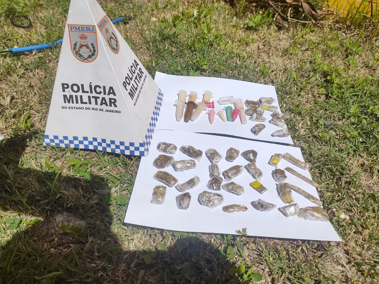 Durante patrulhamento, agentes receberam informações de que o local estaria sendo utilizado por dois homens já conhecidos da guarnição, um de 28 e 31 anos, para esconder entorpecentes. Ao chegarem, os policiais não encontraram os suspeitos, mas localizaram, após buscas no imóvel, um saco plástico contendo 37 tabletes de maconha e 14 pinos de cocaína.