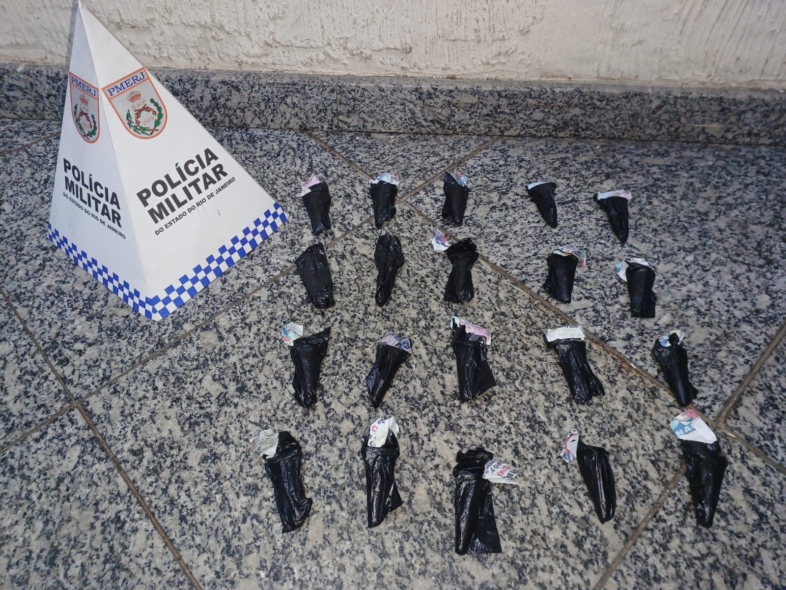 Na sacola, foram encontrados 20 pinos de cocaína, totalizando aproximadamente 20 gramas. Apesar das buscas, o suspeito não foi localizado.
