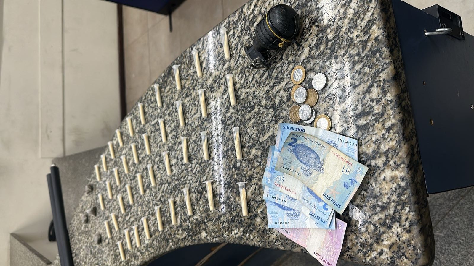 Durante a tentativa de abordagem, alguns suspeitos fugiram. Um deles foi localizado em uma residência próxima após dispensar uma sacola no quintal do imóvel. No interior do objeto, os policiais encontraram uma granada, 39 pinos de cocaína, sete porções de maconha e uma pequena quantia em dinheiro.