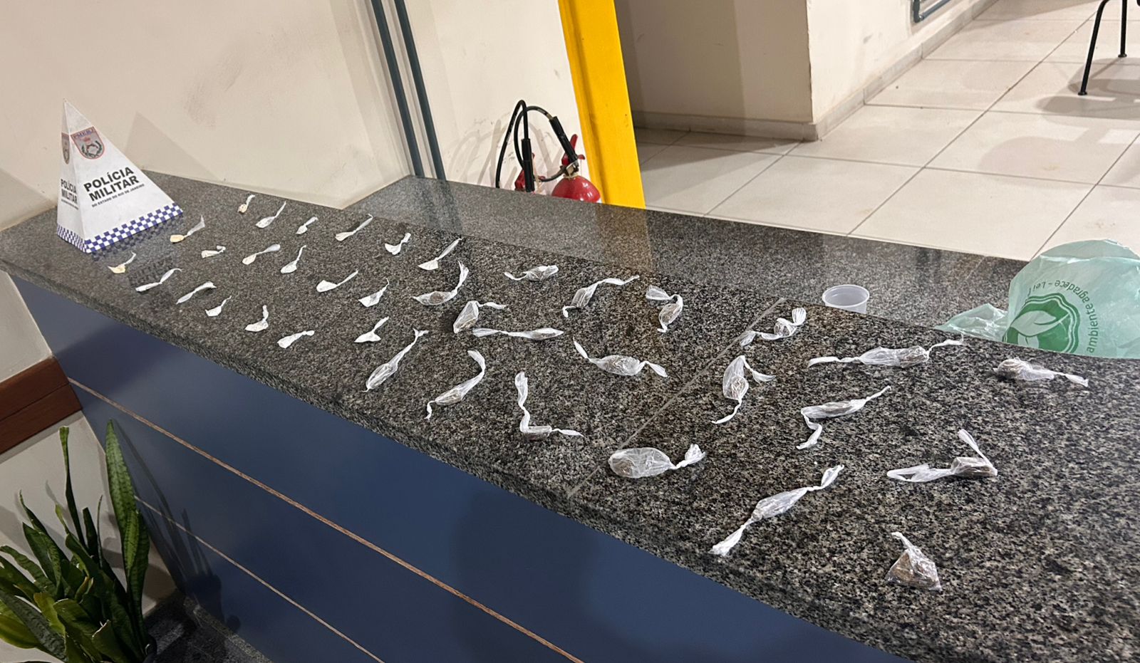 De acordo com a ocorrência, a equipe recebeu denúncia informando que um suspeito conhecido por envolvimento com o tráfico de drogas na região teria sido visto saindo de uma área de bananeiras próxima ao posto de saúde do bairro. Os agentes realizaram buscas no local indicado, onde o suspeito já teria escondido drogas em outras ocasiões.