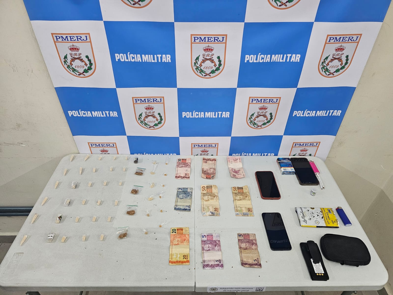 Com os envolvidos, os agentes apreenderam 30 pinos de cocaína, 12 pedras de crack e seis pedaços de maconha, além de três celulares, uma bateria de rádio transmissor e R$ 163 em dinheiro. Após perícia preliminar, foi constatado que o material totalizava aproximadamente 25,5 gramas de cocaína, 2,4 gramas de crack e 3,2 gramas de maconha.