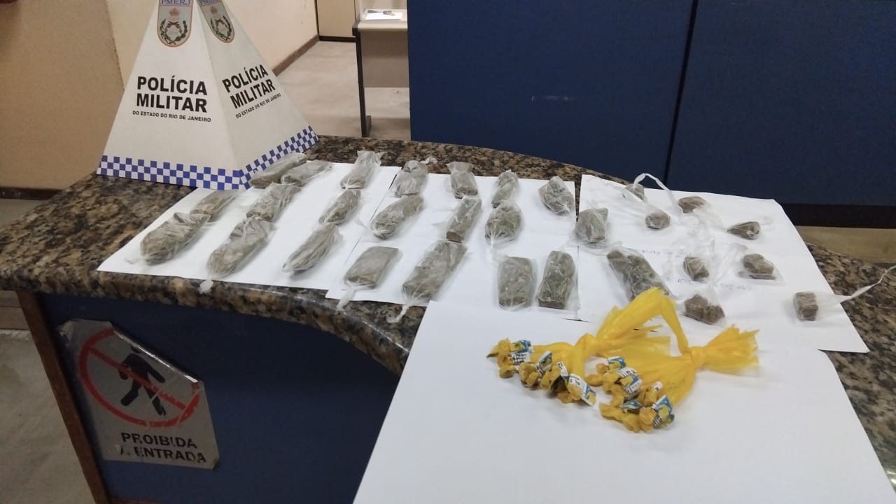 No bairro Santa Terezinha, em Três Rios, policiais do 38º Batalhão de Polícia Militar (BPM) flagraram dois indivíduos envolvidos com o tráfico após denúncia recebida pelo setor de inteligência. Um adolescente de 15 anos foi detido com uma bucha de maconha e um rádio comunicador. Já outro suspeito, de 20 anos, tentou fugir, arremessando uma sacola e um rádio, mas foi alcançado e preso. Com ele, também foi encontrado dinheiro em espécie. Ambos foram conduzidos à 108ª Delegacia de Polícia (DP), onde ficaram à disposição da Justiça pelos crimes de tráfico e associação para o tráfico.