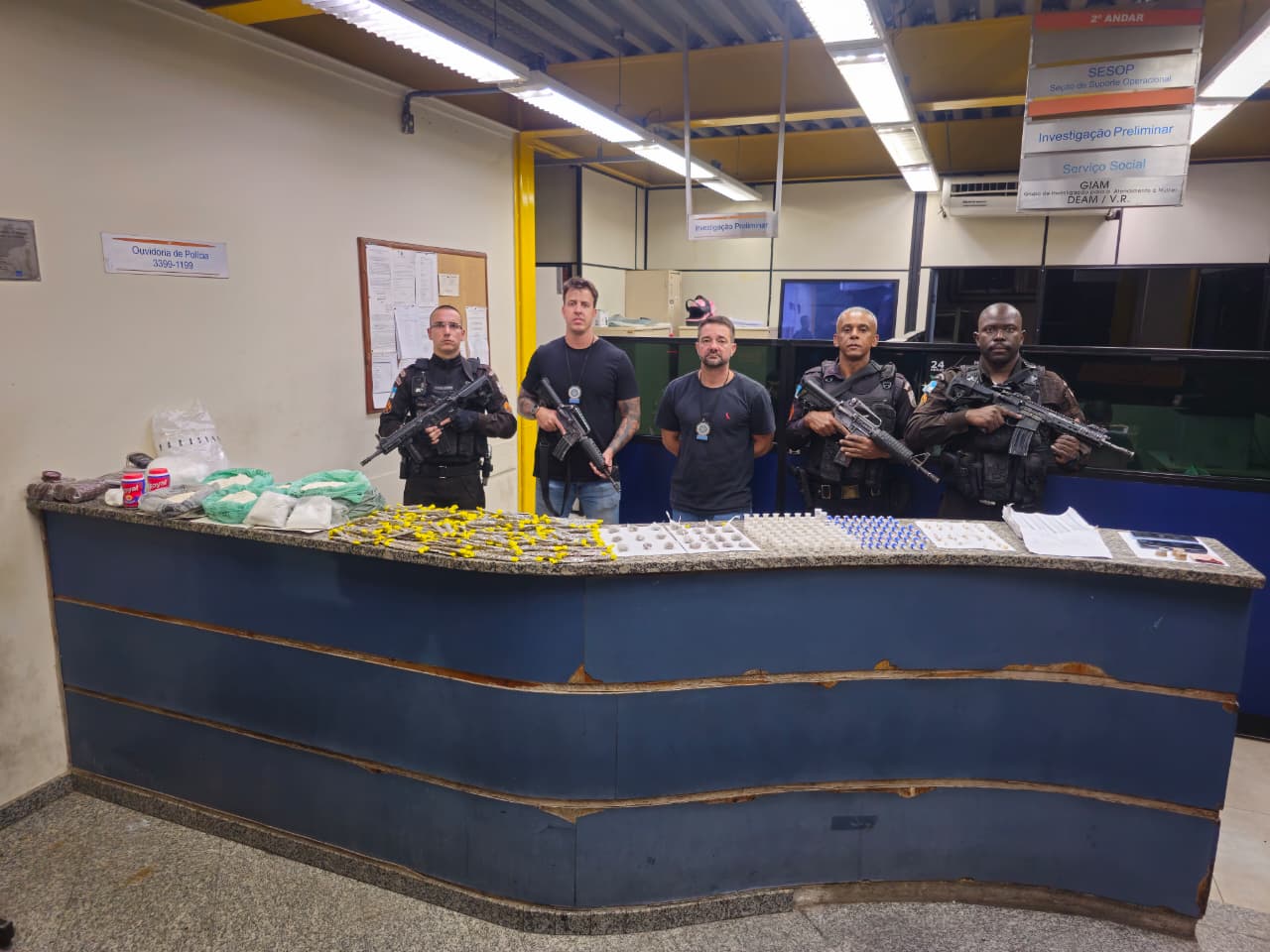 Diante do flagrante, o homem foi autuado na 90ª Delegacia de Polícia (DP) pelos crimes de tráfico de drogas, associação para o tráfico e corrupção de menores, permanecendo preso. Os dois adolescentes foram autuados e apreendidos por ato infracional análogo aos mesmos crimes. Todos eles permaneceram à disposição da Justiça.