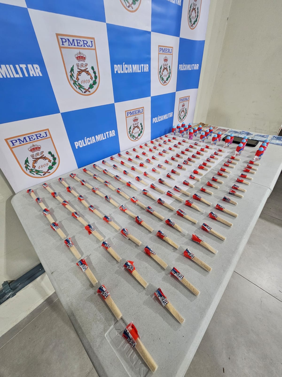 Na ocorrência foram apreendidos 66 pinos de cocaína avaliados em R$ 20 cada, 68 pinos de cocaína avaliados em R$ 10 cada, 22 frascos de substância conhecida como “Lolo”, um aparelho celular e R$ 73 em espécie.