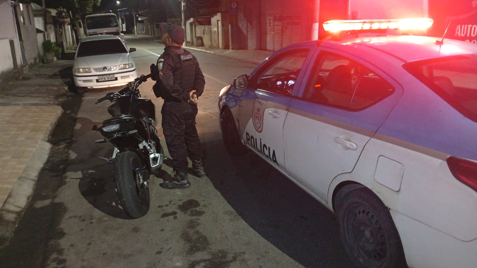Durante o deslocamento até o local, os agentes avistaram uma Honda CB 300 Twister de cor preta, sem placa de identificação. Após consulta ao número do chassi, foi constatado que o veículo tinha sido roubado no município do Rio de Janeiro.