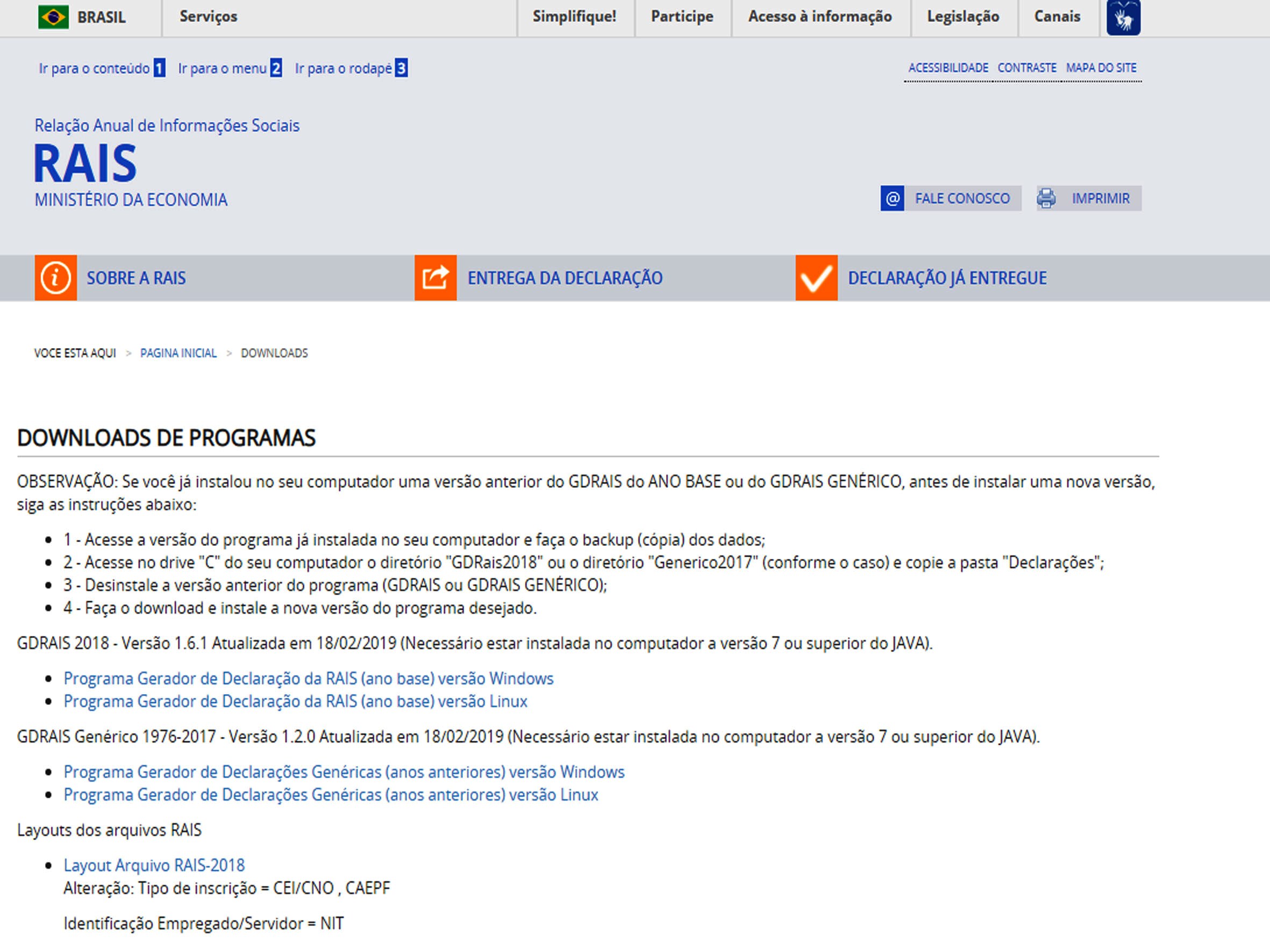 A declaração da Rais só pode ser feita pela internet, com o uso do programa GDRAIS 2018 que deve ser baixado no site www.rais.gov.br. O estabelecimento sem empregado que precisa fazer a declaração negativa deve lançar os dados diretamente no site da Rais, onde consta, inclusive, a relação dos documentos necessários para preenchimento e entrega.