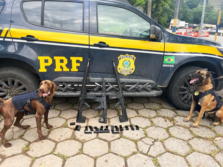 Entretanto, as K9 Cacau e May, cães especialistas no faro de armas e drogas, indicaram a presença de material ilícito no interior do automóvel. Em uma revista mais detalhada, o armamento foi encontrado em um compartimento escondido no porta-malas. Havia dez pistolas, de marcas variadas, além de três fuzis – calibres 7,62mm e 5,56mm.